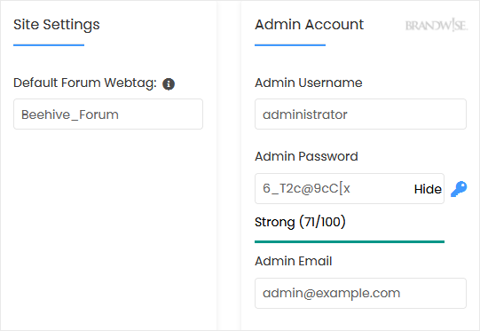 • Admin Username: Your new Beehive username (for security reasons, do not use the administrator or the admin username).