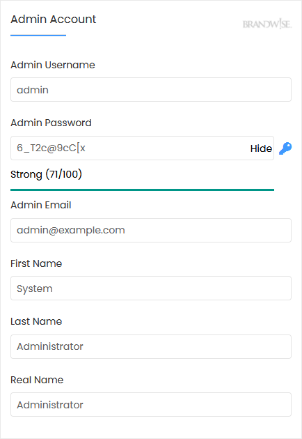 7. Under the Admin Account field, enter the following information: